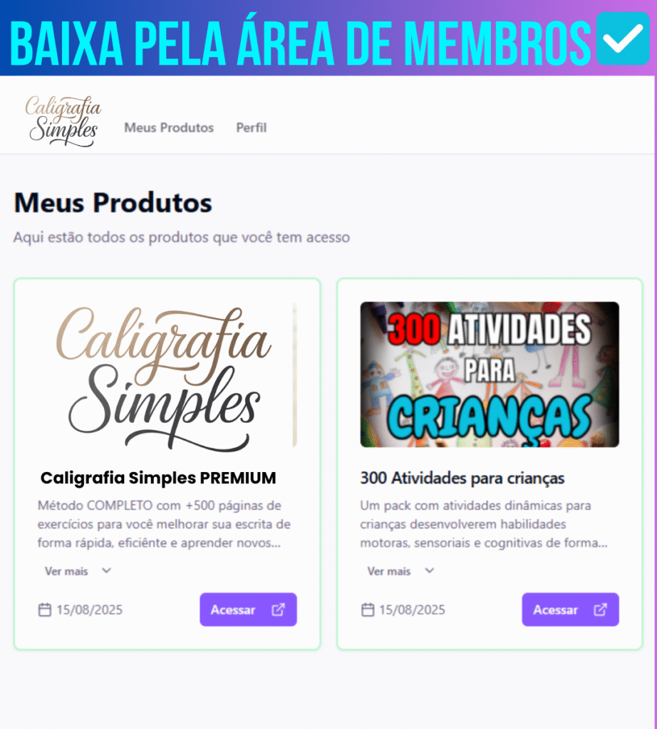 Mais de 300 páginas de exercícios, treinos, atividades infantis, alfabetos completos, técnicas avançadas e materiais exclusivos que não existem em nenhum outro lugar.