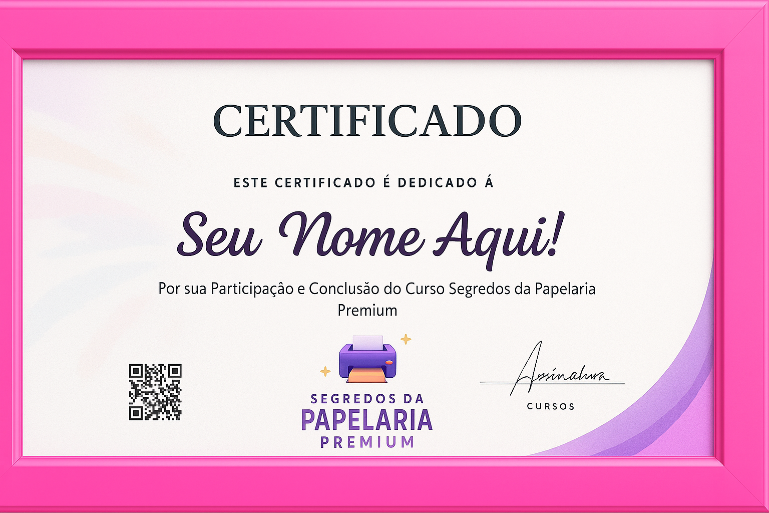 Ao concluir o curso, você terá acesso a um certificado lindo e profissional, disponível diretamente na sua área restrita, pronto para imprimir ou usar no seu portfólio.